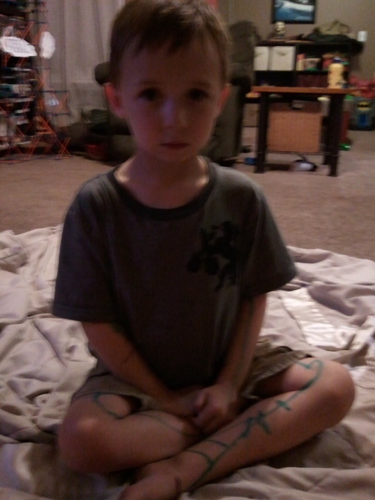 Now don't think that we didn't talk about drawing on ourselves. They know this, but sometimes a four year old(or three) needs to express himself in a way that paper can't let him yet. And that's okay. It washes off eventually.(They weren't washable markers so it might take a bit longer.)